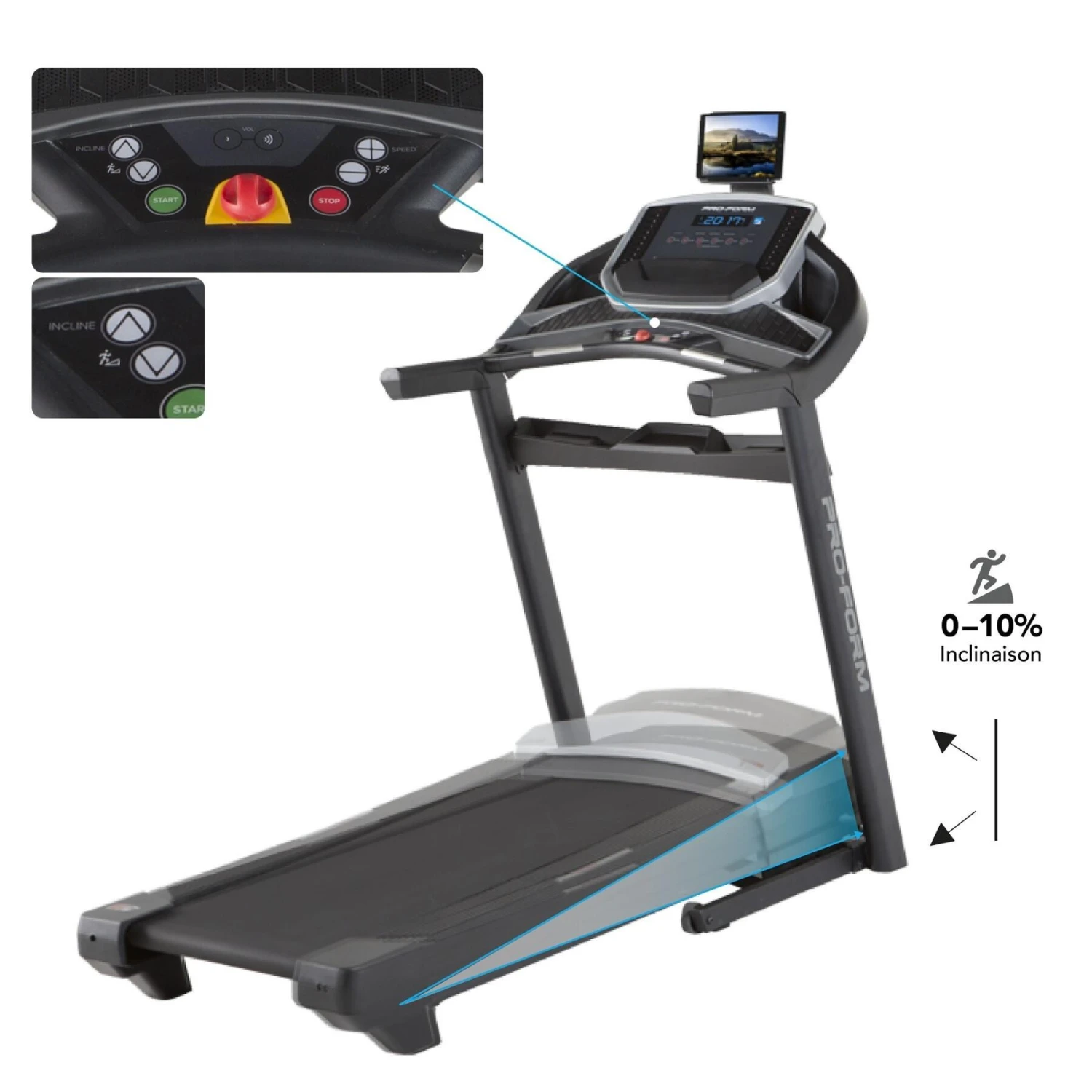 - réglage de l’inclinaison de 0 à 10 % par le système quick incline permettant de varier l’inclinaison par la pression d’une simple touche.