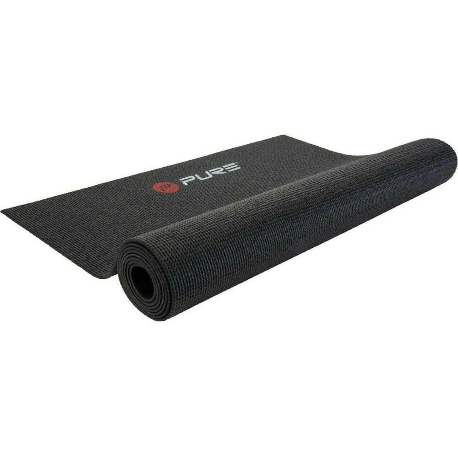tapis de yoga pure2improve pv, 610x1720x4mm, 850 grammes, y compris les sangles élastiques. 30 pour cent de polyester et 70 pour cent de pvc. tapis en pvc de couleur noire. sangles de transport de couleur noire. tapis avec impression du logo pure2improve rouge/blanc. tapis emballé sous film rétractable avec